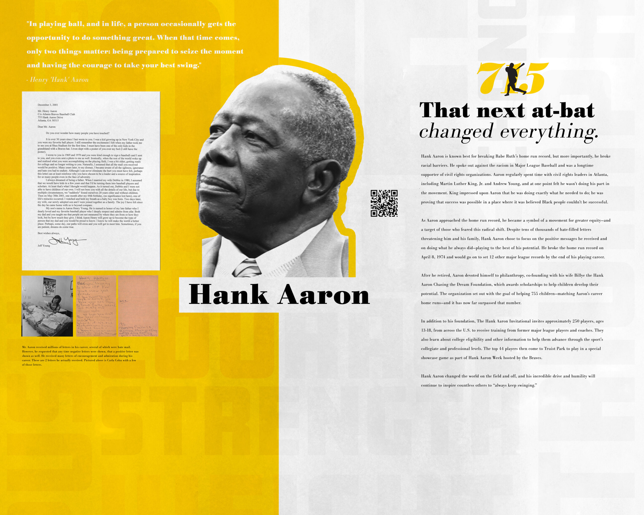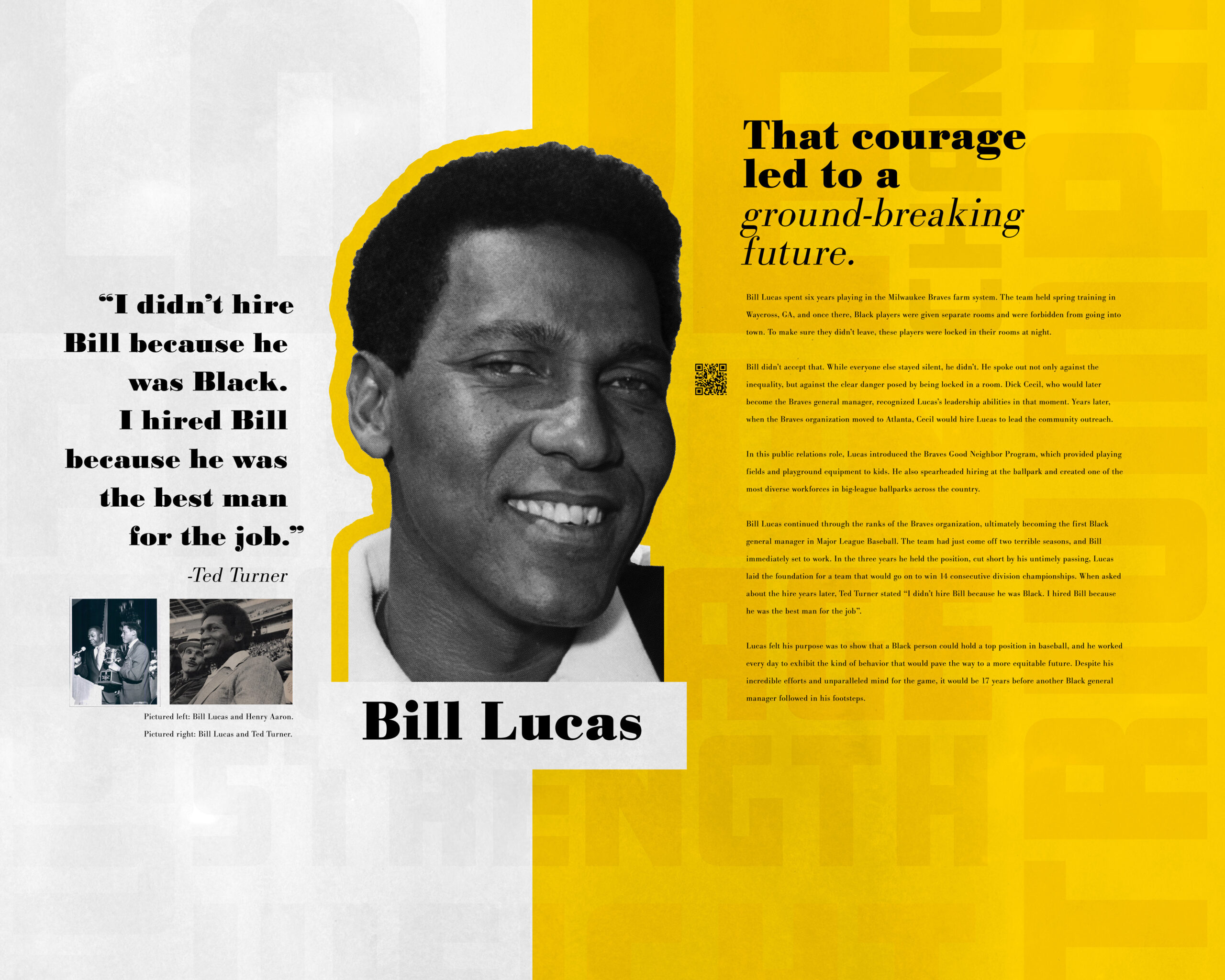 We were approached by Coca-Cola to create an experience for the National Center for Civil and Human Rights that helped tell the story of black men in baseball for the Atlanta Braves. We knew from the very beginning that this was a difficult ask. It is one of the most rewarding projects I’ve ever been a part of. We got to interview several people connected to Hank Aaron, Bill Lucas, and Marquis Grissom. Through these interviews we were able to understand their experiences and craft a story to share those experiences with low tech and high impact. The idea of the exhibit was to put the viewer in the shoes of these men and make them feel the same emotions they felt at different times in their life. Each of the three men had a display in a large room that the viewer could walk up to. It began with Marquis and ended with Hank. The viewer would approach each display in darkness. Radar sensed their presence and began to play dramatic audio describing their story. During impactful pieces of the story, parts of the board would light up in sync with the audio. When the performance ended, the viewer was prompted to walk to the other side, see how the man pushed through hardships and did great things. When the viewer finished with Hank, there was one last wall that highlighted challenges today. It asked the viewer to take a personal pledge to acknowledge the struggle and to continue actively trying to make things better. Each of these men had triumphs and weights heavier than most human beings could imagine, and we got to share these experiences with the public and with the people who loved them. Watching their loved ones and strangers react to these personal moments showed me the incredible power of emotional connection and story that speaks to the deepest levels of the human experience.